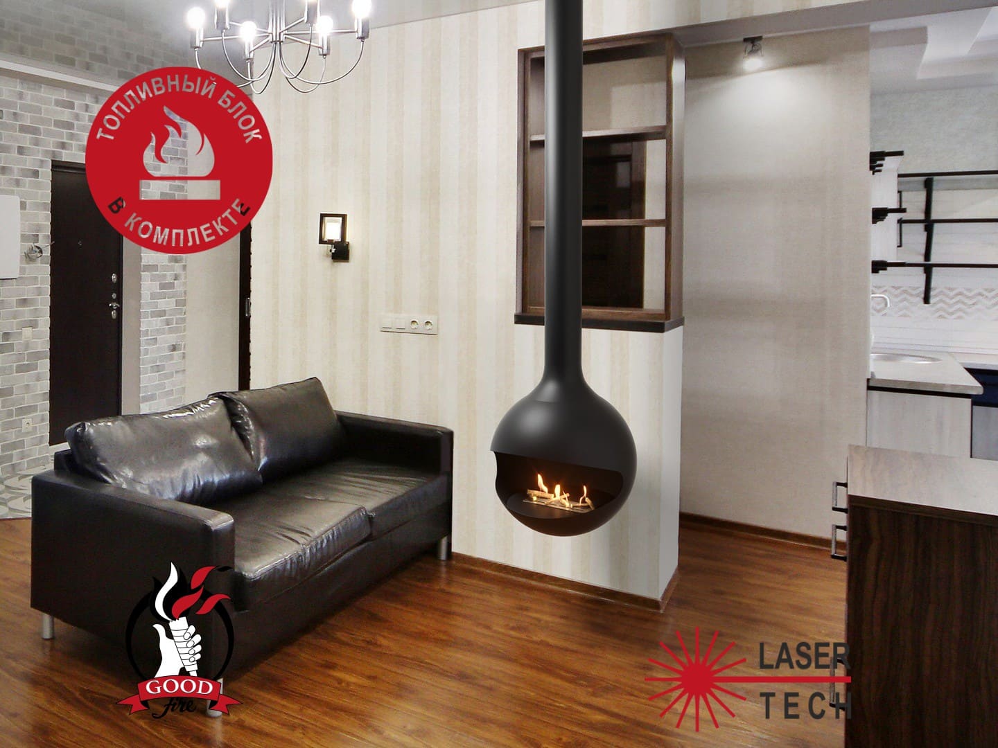 Биокамин "СФЕРА" крепиться к потолку, изображая дымоход традиционного дровяного камина. Но конечно это не дымоход или вентиляция, тем более, что восходящая верх труба закрыта металлическим диском сверху. Во-первых, это позволяет удобно и надежно закрепить биокамин к потолку в помещении. Во-вторых, закрытый "дымоход" защитит потолок от воздействия тепла от горения биокамина.