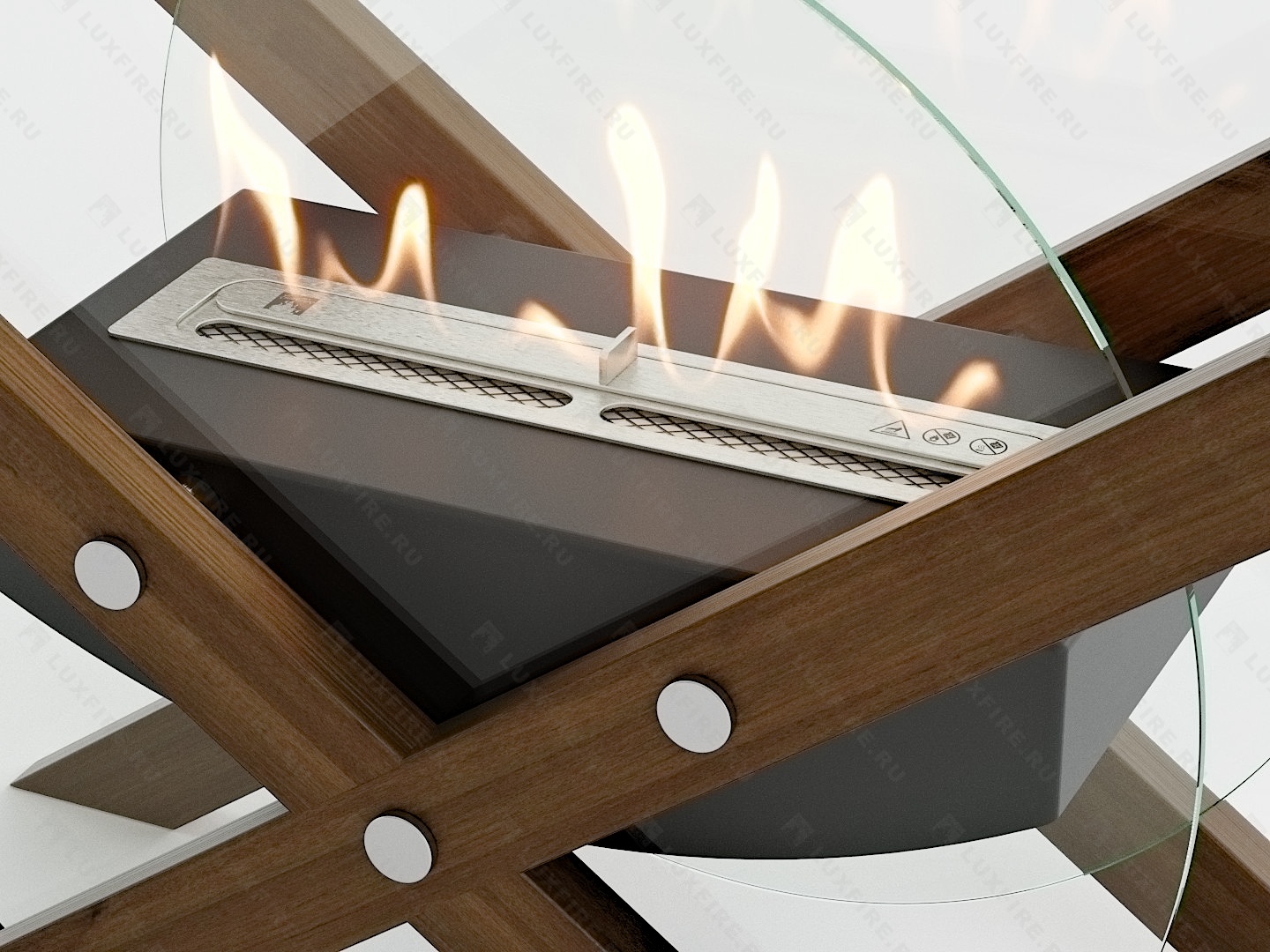 Представляет собой сборную модель оригинального авторского дизайна студии "Vontaren&Grinero" из закаленного стекла и топливного блока Luxfire 350 XS на подиуме, закрепленного на 4 дистанционных держателях. С деревянными натуральными накладками и обработанных огнебиозащитным средством.