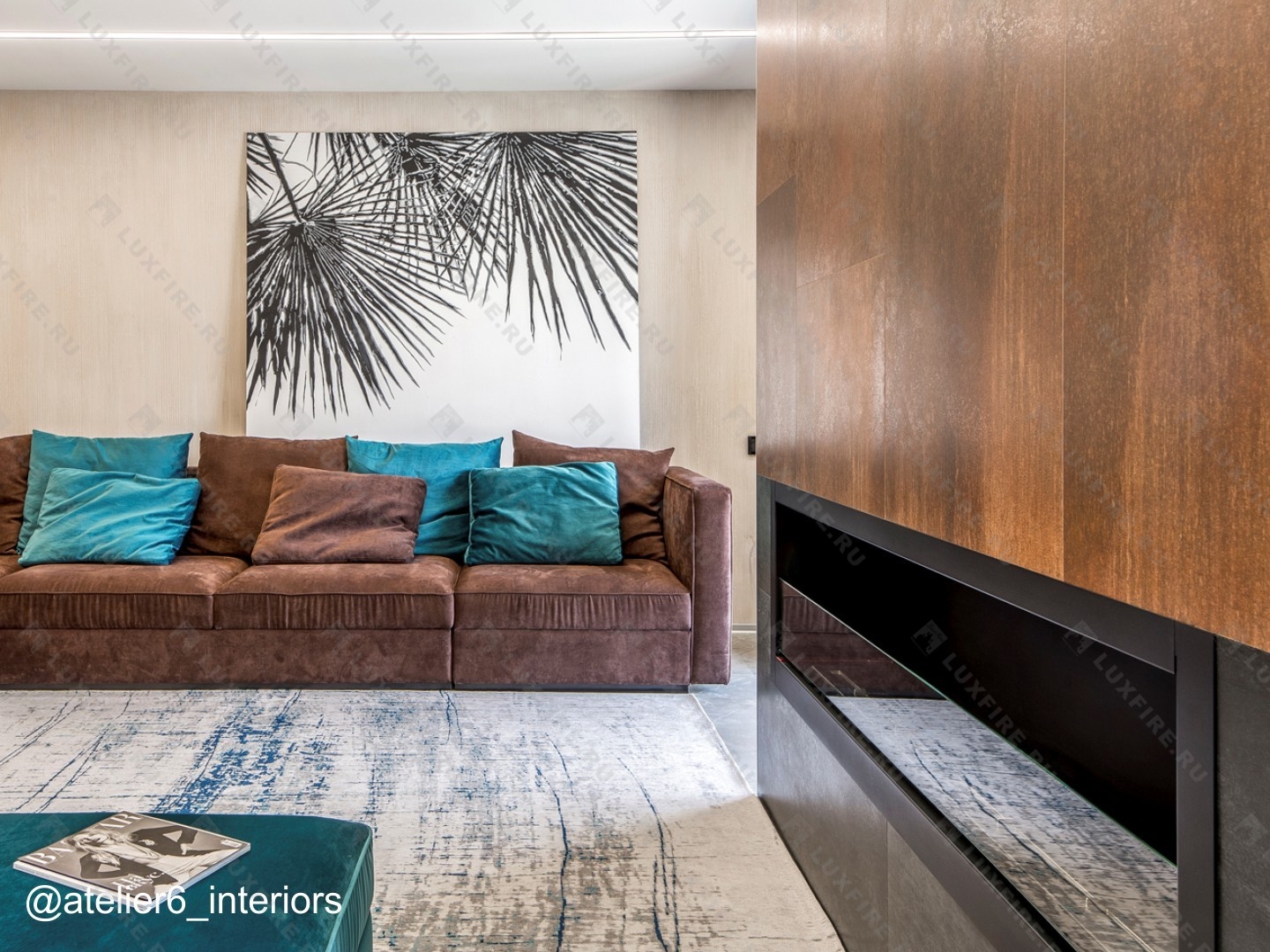 Представляет собой сборную металлическую конструкцию класса М, создающую полузакрытое безопасное пространство для огня с топливным блоком Lux Fire 900МУ ограниченную закаленным стеклом в котором горит живой огонь с углом обзора 180 градусов .