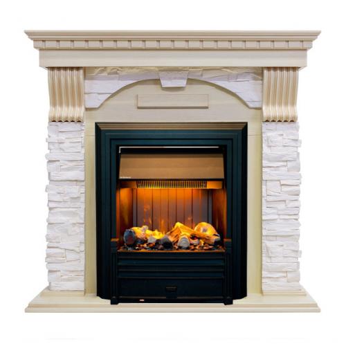 Каминокомплект «Dublin» от производителя Dimplex, оборудован классическим черным очагом «Brookline Black». Несмотря на использование в отделке камня, выгляди камин совершенно немассивно. Обеспечивается это относительно небольшими габаритами конструкции, а также сочетанием в его оформлении светлых расцветок. Поэтому даже в небольшом помещении электрокамин будет смотреться уместно.