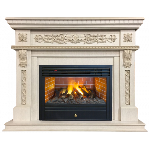 При современной конструкции очаг отлично вписывается в классический образ портала, создавая контраст на фоне светлой расцветки. Его нижняя часть стилизована под зольник с декоративной ручкой. В верхней же части сформирована решетка, за которой скрыт обогреватель и панель управления. Стенки топочной камеры оформлены под кирпич, а боковые стенки расположены под углом, создавая эффект перспективы и увеличивая глубину очага. Также внутрь очага встроен широкий керамический Муляж дров и прогоревших углей, который обеспечивает максимальное сходство с настоящим дровяным аналогом. Основной функцией представленного каминокомплекта является декоративное оформление интерьера, в котором он установлен. Этому способствует дизайн изделия, а также возможность создания уютной обстановки за счет горящего в очаге пламени. Формируется огонь за счет работы системы, основными компонентами которой являются ультразвуковой парогенератор и блок подсветки. Причем парогенератор формирует паровое облако не за счет подогрева воды в резервуаре, а высокочастотных колебаний мембраны. Это обеспечивает его безопасность и более высокую экономичность. Паровую завесу освещают галогеновые лампы, оборудованные светофильтрами. Они создают на фоне завесы объемное изображение языков пламени, над которыми клубится дым. Движение огню придает колебание вытесняемого пара. За счет отсутствия нагревательных элементов, пар в очаге абсолютно холодный. Это значительно повышает общую безопасность изделия. Ведь в этом случае можно буквально прикоснуться к огню, не опасаясь ожогов. Кроме того, тут абсолютно исключен риск возникновения пожара, так как отсутствуют искры и угольки, способные спровоцировать его. На здоровье человека такая система имитации пламени влияния не оказывает, так как при ее работе не выделяется вредных продуктов сгорания топлива. Это также позволяет отказаться от прокладки дымохода в процессе монтажа камина. В конструкцию очага встроен обогреватель, мощность которого достигает 1,7 кВт. Поэтому предлагаемый каминокомплект может быть использован и для обогрева помещения. И такой мощности вполне достаточно для создания комфортных условий не только в каминной зоне, но и в помещении в целом. Мощность обогрева можно снизить вдвое. Также допустима эксплуатация камина в декоративном режиме, когда система имитации пламени работает при отключенном обогреве. Это актуально, если в помещении тепло. Также комплект частично выполняет функцию увлажнителя воздуха. Это становится возможным за счет того, что пар из очага попадает не в вытяжку, а в помещение. Но при этом он абсолютно не вызывает чувства дискомфорта. Купить каминокомплект Estella с очагом 3D Novara 26 вы можете в интернет-магазине «Eco Stroy Complex». Если возникли вопросы или необходимо уточнить отдельные моменты, вам всегда помогут наши менеджеры. Для этого достаточно связаться с ними по телефону или воспользоваться формой обратной связи.Функциональные характеристики каминокомплекта