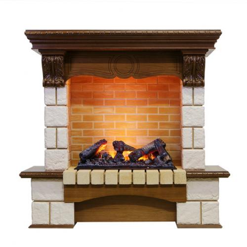 При изготовлении портала использован искусственный камень, который по своей прочности мало уступает натуральному. По составу он представляет собой смесь натуральной каменной крошки, полимера и красителя. Схватившаяся смесь формуется и обрабатывается. В результате камню придается дикая фактура с расшивкой под кирпич. Важным преимуществом искусственного камня является более низкий вес, что отражается на снижении массы готового камина. Декор изготовлен из МДФ, покрытого слоем шпона, декорированного под цвет и фактуру дуба. Такое покрытие не только выполняет декоративную функцию, но дополнительно защищает основу от внешних негативных воздействий.