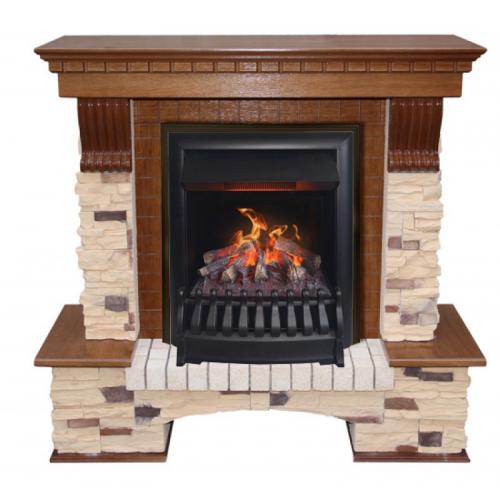 Портал камина оформлен сверху широкой каминной крышкой, которая украшена орнаментальным узором по кромке. Поддерживается крышка по бокам резными консолями. Зона очага оформлена снизу полочками и настоящим камнем. Вокруг очага также имеется вставка, на которую нанесен узор. Нижняя часть камина выполнена в виде ниши, в которую для большей реалистичности можно уложить Муляж дров.