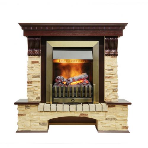 Каминокомплект «Pierre Luxe» от производителя Dimplex оборудован паровым очагом «Danville Antique Brass», который характеризуется максимальной реалистичностью пламени. В оформлении использовано сочетание искусственного камня с фактурой сланца и имитации древесины темного дерева. И это сочетание подчеркивает цвет античного золота, в который окрашена рамка очага. При своей массивности из-за камня портал не слишком загромождает жилое пространство, что обусловлено его небольшой глубиной. Поэтому даже в помещениях небольшой площади установка такого комплекта будет уместна.